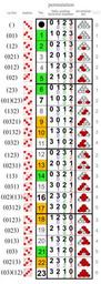 | Keywords: Symmetric group 4; permutation list (0-based).svg All permutations of 0 1 2 3 in reverse colexicographic order Columns cycle notation permutation matrix active right row number of A055089 factorial number converted to decimal <small>if the permutation is not self-conjugate the number of its inverse is shown below</small> one-line notation<small> reflected factorial number below</small> inversion set inversion number A034968 digit sum of factorial number and cardinality of inversion set List of the first 8 4320 permutations of 8 elements in the same order https //oeis org/A198380/a198380_1 txt own Watchduck other versions with permutations of 1 2 3 4 File Symmetric group 4; permutation list svg Other fields I + Symmetric group S4; white green and orange wgo Little-endian factorial numbers Inversion set of a 4-element permutation Colexicographic order 24×4 matrices Permutation matrix; active right |