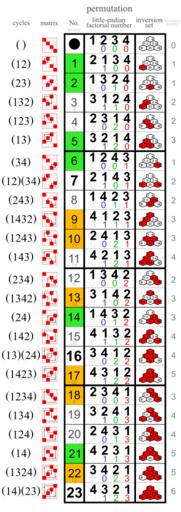 | Keywords: Symmetric group 4; permutation list.svg All permutations of 1 2 3 4 in reverse colexicographic order Columns cycle notation permutation matrix active right row number of A055089 factorial number converted to decimal <small>if the permutation is not self-conjugate the number of its inverse is shown below</small> one-line notation row of array A055089 <small> reflected factorial number below</small> inversion set inversion number A034968 digit sum of factorial number and cardinality of inversion set List of the first 8 4320 permutations of 8 elements in the same order https //oeis org/A198380/a198380_1 txt own Watchduck other versions with permutations of 0 1 2 3 File Symmetric group 4; permutation list 0-based svg<br> Printable version File Symmetric group 4; Cayley table; numbers pdf Other fields I + Symmetric group S4; white green and orange wgo Little-endian factorial numbers Inversion set of a 4-element permutation Colexicographic order 24×4 matrices Permutation matrix; active right |