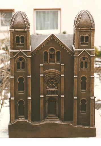 | Keywords: Synagogendenkmal Königstein 1996.JPG de Fotografie des Synagogendenkmals Königstein im Taunus das die Form eines in Bronze gegossenen Modells der ehemaligen Synagoge hat Ansicht des Portals auf der Nordseite Fotografiert im Jahr 1996 von der Bildhauerin die in Zusammenarbeit mit der Gesellschaft für Christlich-Jüdische-Zusammenarbeit Hochtaunus Vorsitzende Ingeborg Klein das Modell schuf own Eva Groth-Pfeifer 1996 Cc-zero Synagoge Königstein Models of synagogues Konigstein | ||||