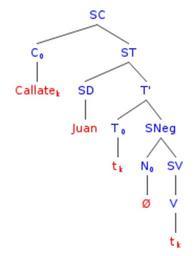 | Keywords: SynTree SpanishNeg03.png en An analysis of the grammatically correct sentence in Spanish Cállate Juan The verbal elemento Cállate moves two times up to the position of nucleos of SC 2013-08-03 own Davius cc-zero Uploaded with UploadWizard Syntax trees Spanish language |
