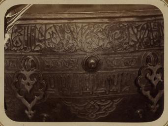 | Keywords: Syr-Darya Oblast. City of Turkestan. Mosque of Saint Sultan Akhmed Iassavi. Continuation of Engraved Inscription Stating that the Bronze was Donated by Emir Timur Kuragan WDL3592.png Artwork ru Богаевский иколай Владими ович 1843 1912 гг fr Bogaevskii Nikolaï V 1843-1912 en Bogaevskii Nikolai V 1843-1912 zh 亚历山大·L· ,1840-1888 年 pt Bogaevskii Nikolai V 1843-1912 ar بوغافسكي، نيكولاي ف ، 1843-1912 es Bogaevskii Nikolai V 1843-1912 ru Сы да ьинская область Го од Ту кестан ечеть святого Султана Ахмеда Ясави П одолжение выг ави ованной надписи сообщающей что б онза была поже твована эми ом Тиму ом Ку аганом fr Oblast de Syr-Darya Ville de Turkestan Mosquée du vénérable sultan Akhmed Iassavi Suite de l'inscription gravée indiquant que le bronze fut donné par l'émir Timour Kuragan en Syr-Darya Oblast City of Turkestan Mosque of Saint Sultan Akhmed Iassavi Continuation of Engraved Inscription Stating that the Bronze was Donated by Emir Timur Kuragan zh 锡尔河 区 其斯 市 苏尔 ·艾哈迈德·亚萨维清 寺 器雕刻铭文的延续部分,铭文指明此器由埃米尔帖 儿·库拉甘捐赠 pt Oblast de Sir Dária Cidade do Turquestão Mesquita do santo sultão Ahmed Iassavi Parte de uma inscrição gravada declarando que a peça em bronze foi doada pelo Emir Timur Kuragan ar منطقة سير داريا مدينة تُرْكِستان مسجد الولي سلطان أحمد يسوي تكملة لنقش محفور يوضح أن هذه القطعة البرونزية هبة من الأمير تيمور كوراغان ru Эта фотог афия элемента итуальной чаши для воды внут и мавзолея Ходжи Ахмеда Ясави в Яси сов еменный Ту кестан Казахстан соде жится в а хеологической части <em> Ту кестанского альбома </em> Шеститомное фотог афическое исследование было подготовлено и издано в 1871 1872 гг под пат онажем гене ала Константина П фон Кауфмана пе вого гене ал-губе нато а 1867 1882 гг Ту кестана как называли в то в емя те ито ию Цент альной Азии п инадлежавшую Российской импе ии Яси ассоции уется с суфийским мистиком Ходжой Ахмедом Ясави 1103 1066 гг великая слава кото ого побудила Тиму а Таме лана пост оить мемо иальную г обницу <em>ханаку</em> на месте его захо онения авзолею пост оенному в 1396 1398 гг п исущи ха акте ные че ты тиму идской а хитекту ы в то в емя пе еживавшей свой асцвет в Сама канде а снимке видна часть большой б онзовой итуальной чаши для воды; в надписи на чаше указано что она была поже твована Тиму ом Чаша ук ашена изысканными ботаническими фигу ами и пе сидско-а абскими надписями аве ху находится п одолжение полосы с надписью выполненной письмом насх и пе еплетающейся с узо ом из завитков Под полосой видны деко ативные б онзовые элементы и еще две полосы с надписями угловатыми буквами а езной пове хности в нижней части фотог афии видна а абеска Высота чаши составляет около одного мет а <br>Котлы; адписи; Ясави Ахмед уме в 1166 г ; Фотог афические исследования; П едметы елигиозного назначения; огильные памятники; Г обницы fr Cette photographie d'un détail du bassin dédié aux ablutions rituelles du mausolée de Khodzha Akhmed Iassavi à Yasi au Turkestan actuel Kazakhstan est extraite de l'ouvrage archéologique <em>Album du Turkestan</em> Cet inventaire photographique en six volumes fut réalisé entre 1871 et 1872 sous le patronage du général Konstantin P von Kaufman premier gouverneur général 1867-1882 du Turkestan nom donné aux territoires d'Asie centrale de l'Empire russe La ville de Yasi est associée au mystique soufi Khodzha Akhmed Iassavi 1103-1166 dont la renommée était telle que Tamerlan fit construire un sanctuaire commémoratif <em>khanaka</em> sur le site de sa tombe Bâti de 1396 à 1398 le mausolée présente les caractéristiques de l'architecture timuride en pleine apogée à Samarcande à cette époque Cette vue partielle du grand bassin dédié aux ablutions rituelles montre l'inscription indiquant qu'il fut donné par Tamerlan Le bassin est richement décoré de figures à fleurs et d'inscriptions perso-arabes Dans la partie supérieure de la photographie la suite d'une bande d'inscription en écriture naskhi entrelacée de motifs de vrilles apparaît Des armatures décoratives en bronze et deux autres bandes d'inscription avec des lettres angulaires sont visibles sous cette bande Au bas de la photographie la surface bombée est ornée d'une arabesque Le bassin mesure environ un mètre de hauteur <br>Chaudrons; Inscriptions; I͡Asavi Akhmed mort en 1166; Inventaires photographiques; Articles religieux; Monuments funéraires; Tombes en This photograph of a detail of a ritual basin in the interior of the mausoleum of Khodzh