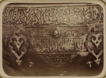 | Keywords: Syr-Darya Oblast. City of Turkestan. Beginning of the Inscription Bordering the Exterior of the Cauldron Located in the Tomb of Saint Sultan Akhmed Iassavi WDL3593.png Artwork ru Богаевский иколай Владими ович 1843 1912 гг fr Bogaevskii Nikolaï V 1843-1912 en Bogaevskii Nikolai V 1843-1912 zh 亚历山大·L· ,1840-1888 年 pt Bogaevskii Nikolai V 1843-1912 ar بوغافسكي، نيكولاي ف ، 1843-1912 es Bogaevskii Nikolai V 1843-1912 ru Сы да ьинская область Го од Ту кестан ачало надписи окаймляющей на ужную сто ону котла находящегося в г обнице святого султана Ахмеда Яссави fr Oblast de Syr-Darya Ville de Turkestan Début de l'inscription bordant l'extérieur du chaudron situé dans le sépulcre du vénérable sultan Akhmed Iassavi en Syr-Darya Oblast City of Turkestan Beginning of the Inscription Bordering the Exterior of the Cauldron Located in the Tomb of Saint Sultan Akhmed Iassavi zh 锡尔河 区 其斯 市 苏尔 ·艾哈迈德·亚萨维墓 内的大锅 外表环绕的铭文 头部分 pt Oblast de Sir Dária Cidade do Turquestão Início da inscrição que rodeia o exterior da pia ritual localizada no túmulo do santo sultão Ahmed Iassavi ar منطقة سير داريا مدينة تُرْكِستان بداية النقش الذي يُؤطِّر الجزء الخارجي للميضأة الموجودة في ضريح الولي سلطان أحمد يسوي ru Эта фотог афия элемента итуальной чаши для воды внут и мавзолея Ходжи Ахмеда Ясави в Яси сов еменный Ту кестан Казахстан соде жится в а хеологической части <em> Ту кестанского альбома </em> Шеститомное фотог афическое исследование было подготовлено и издано в 1871 1872 гг под пат онажем гене ала Константина П фон Кауфмана пе вого гене ал-губе нато а 1867 1882 гг Ту кестана как называли в то в емя те ито ию Цент альной Азии п инадлежавшую Российской импе ии Яси ассоции уется с суфийским мистиком Ходжой Ахмедом Ясави 1103 1066 гг великая слава кото ого побудила Тиму а Таме лана пост оить мемо иальную г обницу <em>ханаку</em> на месте его захо онения авзолею пост оенному в 1396 1398 гг п исущи ха акте ные че ты тиму идской а хитекту ы в то в емя пе еживавшей свой асцвет в Сама канде а снимке видна часть большой б онзовой итуальной чаши для воды; в надписи на чаше указано что она была поже твована Тиму ом Чаша ук ашена изысканными ботаническими фигу ами и пе сидско-а абскими надписями аве ху находится полоса с надписью выполненной письмом насх и пе еплетающейся с узо ом из завитков Под полосой видны деко ативные б онзовые элементы и еще одна надпись угловатыми буквами а езной пове хности в нижней части фотог афии видна а абеска Высота чаши составляет около одного мет а <br>Котлы; адписи; Ясави Ахмед уме в 1166 г ; Фотог афические исследования; П едметы елигиозного назначения; огильные памятники; Г обницы fr Cette photographie d'un détail du bassin dédié aux ablutions rituelles du mausolée de Khodzha Akhmed Iassavi à Yasi au Turkestan actuel Kazakhstan est extraite de l'ouvrage archéologique <em>Album du Turkestan</em> Cet inventaire photographique en six volumes fut réalisé entre 1871 et 1872 sous le patronage du général Konstantin P von Kaufman premier gouverneur général 1867-1882 du Turkestan nom donné aux territoires d'Asie centrale de l'Empire russe La ville de Yasi est associée au mystique soufi Khodzha Akhmed Iassavi 1103-1166 dont la renommée était telle que Tamerlan fit construire un sanctuaire commémoratif <em>khanaka</em> sur le site de sa tombe Bâti de 1396 à 1398 le mausolée présente les caractéristiques de l'architecture timuride en pleine apogée à Samarcande à cette époque Cette vue partielle du grand bassin dédié aux ablutions rituelles montre l'inscription indiquant qu'il fut donné par Tamerlan Le bassin est richement décoré de figures à fleurs et d'inscriptions perso-arabes Dans la partie supérieure de la photographie une bande d'inscription en écriture naskhi entrelacée de motifs de vrilles apparaît Des armatures décoratives en bronze et une autre inscription avec des lettres angulaires sont visibles sous cette bande Au bas de la photographie la surface bombée est ornée d'une arabesque Le bassin mesure environ un mètre de hauteur <br>Chaudrons; Inscriptions; I͡Asavi Akhmed mort en 1166; Inventaires photographiques; Articles religieux; Monuments funéraires; Tombes en This photograph of a detail of a ritual basin in the interior of the mausoleum of Khodzha Akhmed Iassavi in Yasi present-day Turkestan Kazakhstan is from the archeological part of <em>Turkestan Album</em> The six-volume photographic survey was produced in 1871-72 under the patronage of General Konstantin P von Kaufman the first governor-general 1867-82 o