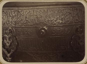 | Keywords: Syr-Darya Oblast. City of Turkestan. Beginning of the Inscription Bordering the Exterior of the Cauldron Located in the Tomb of Saint Sultan Akhmed Iassavi WDL3595.png Artwork ru Богаевский иколай Владими ович 1843 1912 гг fr Bogaevskii Nikolaï V 1843-1912 en Bogaevskii Nikolai V 1843-1912 zh 亚历山大·L· ,1840-1888 年 pt Bogaevskii Nikolai V 1843-1912 ar بوغافسكي، نيكولاي ف ، 1843-1912 es Bogaevskii Nikolai V 1843-1912 ru Сы да ьинская область Го од Ту кестан ачало надписи окаймляющей на ужную сто ону котла находящегося в г обнице святого султана Ахмеда Яссави fr Oblast de Syr-Darya Ville de Turkestan Début de l'inscription bordant l'extérieur du chaudron situé dans le sépulcre du vénérable sultan Akhmed Iassavi en Syr-Darya Oblast City of Turkestan Beginning of the Inscription Bordering the Exterior of the Cauldron Located in the Tomb of Saint Sultan Akhmed Iassavi zh 锡尔河 区 其斯 市 苏尔 ·艾哈迈德·亚萨维墓 内的大锅 外表环绕的铭文 头部分 pt Oblast de Sir Dária Cidade do Turquestão Início da inscrição que rodeia o exterior da pia ritual localizada no túmulo do santo sultão Ahmed Iassavi ar منطقة سير داريا مدينة تُرْكِستان بداية النقش الذي يُؤطِّر الجزء الخارجي للميضأة الموجودة في ضريح الولي سلطان أحمد يسوي ru Эта фотог афия элемента итуальной чаши для воды внут и мавзолея Ходжи Ахмеда Ясави в Яси сов еменный Ту кестан Казахстан соде жится в а хеологической части <em> Ту кестанского альбома </em> Шеститомное фотог афическое исследование было подготовлено и издано в 1871 1872 гг под пат онажем гене ала Константина П фон Кауфмана пе вого гене ал-губе нато а 1867 1882 гг Ту кестана как называли в то в емя те ито ию Цент альной Азии п инадлежавшую Российской импе ии Яси ассоции уется с суфийским мистиком Ходжой Ахмедом Ясави 1103 1066 гг великая слава кото ого побудила Тиму а Таме лана пост оить мемо иальную г обницу <em>ханаку</em> на месте его захо онения авзолею пост оенному в 1396 1398 гг п исущи ха акте ные че ты тиму идской а хитекту ы в то в емя пе еживавшей свой асцвет в Сама канде а снимке видна часть большой б онзовой итуальной чаши для воды; в надписи на чаше указано что она была поже твована Тиму ом Чаша ук ашена изысканными ботаническими фигу ами и пе сидско-а абскими надписями аве ху находится полоса с надписью выполненной письмом насх и пе еплетающейся с узо ом из завитков Под полосой видны деко ативные б онзовые элементы и еще одна надпись угловатыми буквами а езной пове хности в нижней части фотог афии видна а абеска Высота чаши составляет около одного мет а <br>Котлы; адписи; Ясави Ахмед уме в 1166 г ; Фотог афические исследования; П едметы елигиозного назначения; огильные памятники; Г обницы fr Cette photographie d'un détail du bassin dédié aux ablutions rituelles du mausolée de Khodzha Akhmed Iassavi à Yasi au Turkestan actuel Kazakhstan est extraite de l'ouvrage archéologique <em>Album du Turkestan</em> Cet inventaire photographique en six volumes fut réalisé entre 1871 et 1872 sous le patronage du général Konstantin P von Kaufman premier gouverneur général 1867-1882 du Turkestan nom donné aux territoires d'Asie centrale de l'Empire russe La ville de Yasi est associée au mystique soufi Khodzha Akhmed Iassavi 1103-1166 dont la renommée était telle que Tamerlan fit construire un sanctuaire commémoratif <em>khanaka</em> sur le site de sa tombe Bâti de 1396 à 1398 le mausolée présente les caractéristiques de l'architecture timuride en pleine apogée à Samarcande à cette époque Cette vue partielle du grand bassin dédié aux ablutions rituelles montre l'inscription indiquant qu'il fut donné par Tamerlan Le bassin est richement décoré de figures à fleurs et d'inscriptions perso-arabes Dans la partie supérieure de la photographie une bande d'inscription en écriture naskhi entrelacée de motifs de vrilles apparaît Des armatures décoratives en bronze et une autre inscription avec des lettres angulaires sont visibles sous cette bande Au bas de la photographie la surface bombée est ornée d'une arabesque Le bassin mesure environ un mètre de hauteur <br>Chaudrons; Inscriptions; I͡Asavi Akhmed mort en 1166; Inventaires photographiques; Articles religieux; Monuments funéraires; Tombes en This photograph of a detail of a ritual basin in the interior of the mausoleum of Khodzha Akhmed Iassavi in Yasi present-day Turkestan Kazakhstan is from the archeological part of <em>Turkestan Album</em> The six-volume photographic survey was produced in 1871-72 under the patronage of General Konstantin P von Kaufman the first governor-general 1867-82 o