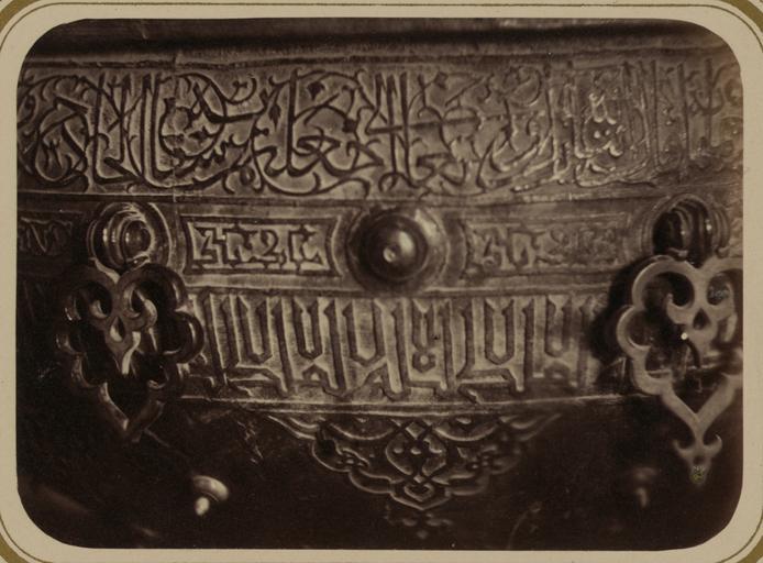 | Keywords: Syr-Darya Oblast. City of Turkestan. Beginning of the Inscription Bordering the Exterior of the Cauldron Located in the Tomb of Saint Sultan Akhmed Iassavi WDL3598.png Artwork ru Богаевский иколай Владими ович 1843 1912 гг fr Bogaevskii Nikolaï V 1843-1912 en Bogaevskii Nikolai V 1843-1912 zh 亚历山大·L· ,1840-1888 年 pt Bogaevskii Nikolai V 1843-1912 ar بوغافسكي، نيكولاي ف ، 1843-1912 es Bogaevskii Nikolai V 1843-1912 ru Сы да ьинская область Го од Ту кестан ачало надписи окаймляющей на ужную сто ону котла находящегося в г обнице святого султана Ахмеда Яссави fr Oblast de Syr-Darya Ville de Turkestan Début de l'inscription bordant l'extérieur du chaudron situé dans le sépulcre du vénérable sultan Akhmed Iassavi en Syr-Darya Oblast City of Turkestan Beginning of the Inscription Bordering the Exterior of the Cauldron Located in the Tomb of Saint Sultan Akhmed Iassavi zh 锡尔河 区 其斯 市 苏尔 ·艾哈迈德·亚萨维墓 内的大锅 外表环绕的铭文 头部分 pt Oblast de Sir Dária Cidade do Turquestão Início da inscrição que rodeia o exterior da pia ritual localizada no túmulo do santo sultão Ahmed Iassavi ar منطقة سير داريا مدينة تُرْكِستان بداية النقش الذي يُؤطِّر الجزء الخارجي للميضأة الموجودة في ضريح الولي سلطان أحمد يسوي ru Эта фотог афия элемента итуальной чаши для воды внут и мавзолея Ходжи Ахмеда Ясави в Яси сов еменный Ту кестан Казахстан соде жится в а хеологической части <em> Ту кестанского альбома </em> Шеститомное фотог афическое исследование было подготовлено и издано в 1871 1872 гг под пат онажем гене ала Константина П фон Кауфмана пе вого гене ал-губе нато а 1867 1882 гг Ту кестана как называли в то в емя те ито ию Цент альной Азии п инадлежавшую Российской импе ии Яси ассоции уется с суфийским мистиком Ходжой Ахмедом Ясави 1103 1066 гг великая слава кото ого побудила Тиму а Таме лана пост оить мемо иальную г обницу <em>ханаку</em> на месте его захо онения авзолею пост оенному в 1396 1398 гг п исущи ха акте ные че ты тиму идской а хитекту ы в то в емя пе еживавшей свой асцвет в Сама канде а снимке видна часть большой б онзовой итуальной чаши для воды; в надписи на чаше указано что она была поже твована Таме ланом Чаша ук ашена изысканными ботаническими фигу ами и пе сидско-а абскими надписями аве ху находится полоса с надписью выполненной письмом насх и пе еплетающейся с узо ом из завитков Под полосой видны деко ативные б онзовые элементы и еще одна надпись угловатыми буквами а езной пове хности в нижней части фотог афии видна а абеска Высота чаши составляет около одного мет а <br>Котлы; адписи; Ясави Ахмед уме в 1166 г ; Фотог афические исследования; П едметы елигиозного назначения; огильные памятники; Г обницы fr Cette photographie d'un détail du bassin dédié aux ablutions rituelles du mausolée de Khodzha Akhmed Iassavi à Yasi au Turkestan actuel Kazakhstan est extraite de l'ouvrage archéologique <em>Album du Turkestan</em> Cet inventaire photographique en six volumes fut réalisé entre 1871 et 1872 sous le patronage du général Konstantin P von Kaufman premier gouverneur général 1867-1882 du Turkestan nom donné aux territoires d'Asie centrale de l'Empire russe La ville de Yasi est associée au mystique soufi Khodzha Akhmed Iassavi 1103-1166 dont la renommée était telle que Tamerlan fit construire un sanctuaire commémoratif <em>khanaka</em> sur le site de sa tombe Bâti de 1396 à 1398 le mausolée présente les caractéristiques de l'architecture timuride en pleine apogée à Samarcande à cette époque Cette vue partielle du grand bassin dédié aux ablutions rituelles montre l'inscription indiquant qu'il fut donné par Tamerlan Le bassin est richement décoré de figures à fleurs et d'inscriptions perso-arabes Dans la partie supérieure de la photographie une bande d'inscription en écriture naskhi entrelacée de motifs de vrilles apparaît Des armatures décoratives en bronze et une autre inscription avec des lettres angulaires sont visibles sous cette bande Au bas de la photographie la surface bombée est ornée d'une arabesque Le bassin mesure environ un mètre de hauteur <br>Chaudrons; Inscriptions; I͡Asavi Akhmed mort en 1166; Inventaires photographiques; Articles religieux; Monuments funéraires; Tombes en This photograph of a detail of a ritual basin in the interior of the mausoleum of Khodzha Akhmed Iassavi in Yasi present-day Turkestan Kazakhstan is from the archeological part of <em>Turkestan Album</em> The six-volume photographic survey was produced in 1871-72 under the patronage of General Konstantin P von Kaufman the first governor-general 186