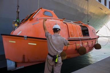 | Keywords: Syrian chemical agents destruction 140603-N-XB010-011.jpg en Michael Tuttle a third mate aboard the roll-on/roll-off and container ship MV Cape Ray gives instructions using hand signals during preventative maintenance checks of the ship's starboard lifeboat in Rota Spain June 3 2014 The U S government-owned MV Cape Ray was modified and deployed to the eastern Mediterranean Sea to dispose of Syrian chemical agents in accordance with terms Syria agreed to in late 2013 <br>Unit Defense Imagery Management Operations Center 2014-06-03 T-AKR 9679 https //www dvidshub net/image/1427862/syrian-chemical-agents-destruction 140603-N-XB010-011 2014-07-01 03 22 MV CAPE RAY T-AKR 9679 ES PD-USGov-Military-Navy MV Cape Ray T-AKR-9679 Images from DoD uploaded by Fæ |
