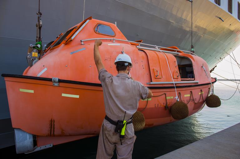 Keywords: Syrian chemical agents destruction 140603-N-XB010-011.jpg en Michael Tuttle a third mate aboard the roll-on/roll-off and container ship MV Cape Ray gives instructions using hand signals during preventative maintenance checks of the ship's starboard lifeboat in Rota Spain June 3 2014 The U S government-owned MV Cape Ray was modified and deployed to the eastern Mediterranean Sea to dispose of Syrian chemical agents in accordance with terms Syria agreed to in late 2013 <br>Unit Defense Imagery Management Operations Center 2014-06-03 T-AKR 9679 https //www dvidshub net/image/1427862/syrian-chemical-agents-destruction 140603-N-XB010-011 2014-07-01 03 22 MV CAPE RAY T-AKR 9679 ES PD-USGov-Military-Navy MV Cape Ray T-AKR-9679 Images from DoD uploaded by Fæ |