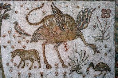 | Keywords: Syrian Ostrich and Leopard.jpg Roman era mosaic depicting a Leopard attacking an Ostrich Exhibited on the outer wall of the National Museum Damascus Syria http //www flickr com/photos/libyan_soup/2898714685/in/photostream/ Pre-600s Photo by Libyan Soup on FLickr PD-old Struthio camelus syriacus Extinct birds illustrated while extant Wild animals in ancient Roman mosaics Birds in ancient Roman mosaics Ostriches in art | ||||