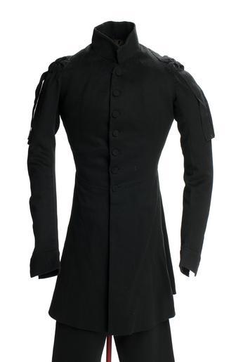 | Keywords: Syrtut till sorglivré 1800-talets mitt - Livrustkammaren - 100410.tif LSH artwork sv Syrtut av svart kläde <br/>Rock med ståndkrage livsöm enkelknäppning och smalt ryggstycke <br/>Knäppning med sex klädda knappar <br/>Sprund bak med sydda veck på var sida I vecken fickor <br/>I livsömmen två knappar <br/>I kragen hyska och hake <br/>Ärmar med sydda slag knäppt med två knappar <br/>På axlarna finns svarta band påsydda lagde i form av en rosett med bandets ändar fritt nedhängande <br/>Sorglivré för kammarpage jämför med teckning nr 57 i handskriften Konung Carl XIV Johans hof- och ordens costumer från 1844 av Adolf Ulrik Schützercrantz En reform med förändring av sorgdräkten infördes i samband med Karl XIV Johans begravning 1844 original caption Syrtut till sorglivré 1800-talets mitt <br/> Nyckelord Sorgedräkt Svart Föremålsbild Kläder mid other date century 19 broadcloth Färg svart d1 - dräkt - yttermaterial material kläde - linen Färg svart d4 - Dräkt - passpoaler band kantning uppslag material linne - cotton Färg brunsvart d2 - dräkt - foder material bomull size mm 810 bak size mm 630 ärm size mm 810 fram size mm 60 krage LRK Dödens teater 2015-2016 Livrustkammaren place of origin original filename lm_dig16081 51400 inventory number LRK 14944 100410 CC-BY-SA Jens Mohr <gallery caption Related objects > File Syrtut till sorglivré 1800-talets mitt - Livrustkammaren - 100411 tif LRK 14945 File Syrtut till sorglivré 1800-talets mitt - Livrustkammaren - 100407 tif LRK 14946 File Syrtut till sorglivré 1800-talets mitt - Livrustkammaren - 100409 tif LRK 14945 File Knäbyxor till sorglivré - Livrustkammaren - 100414 tif LRK 14957 File Knäbyxor till sorglivré - Livrustkammaren - 100413 tif LRK 14956 File Knäbyxor till sorglivré - Livrustkammaren - 100415 tif LRK 14961 File Syrtut till sorglivré 1800-talets mitt - Livrustkammaren - 100408 tif LRK 14947 File Knäbyxor till sorglivré - Livrustkammaren - 100412 tif LRK 14958 </gallery> Black Mourning clothing Clothing Civil uniforms of Sweden Jens Mohr Media contributed by LSH dim-with multiple size templates Media contributed by LSH 2015-11 Color images from Livrustkammaren |