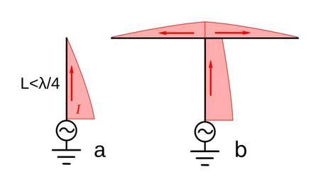| Keywords: T antenna vs vertical antenna.svg T antenna b with the current in a vertical radiator a of the same height demonstrating how the horizontal wire improves its efficiency The T antenna is used at frequencies where a full quarter-wave λ/4 vertical antenna can't be built So the vertical portion of the antennas are much shorter than λ/4 These electrically short antennas have low radiation resistance and can't radiate much power The horizontal wire in the T antenna doesn't radiate radio waves but instead functions as a capacitive top-load to add capacitance to the antenna increasing the current in the top of the vertical wire <br> The red areas are graphs of the current distribution on the wires with the width perpendicular to the wire proportional to the current The current in the antennas assuming they are brought to resonance with an impedance matching network is the tail end of a sinusoidal standing wave In the vertical antenna a the current must go to zero at the top reducing the current in the upper part of the wire As can be seen in the T current flows from the top of the vertical wire into the arms of the T increasing the current in the vertical wire <br> The power output from each antenna is proportional to the square of it's effective height which is equal to the area of the red current distribution graph next to the vertical wire In a the current distribution is roughly triangular so the effective height is about L/2 In the T the current distribution is more trapezoidal approaching constant current for long horizontal wires so the effective height approaches L Therefore the radiation resistance and power output of the T antenna can be up to 4 times that of a simple vertical antenna of the same height <br> La distribution de l'intensité de couleur rouge dans une antenne verticale a et dans l'antenne T b en montrant comment le fil horizontal sert à améliorer l'efficacité du fil vertical rayonnant A la résonance le courant dans la partie de queue est une fr sinusoïde d' fr ondes stationnaires Dans l'antenne verticale le courant passe à zéro à la partie supérieure Dans le T le courant circule dans le fil horizontal augmente le courant dans la partie supérieure du fil vertical Le résistance de rayonnement et donc la puissance rayonnée est proportionnelle au carré de la superficie de la partie verticale <br />Les intensités électrique dans les deux demi-brins horizontaux sont de sens opposés donc les deux champs radioélectrique créés s'annules mutuellement seul le brin vertical participe au rayonnement de l' fr antenne radioélectrique 2012-02-23 own Chetvorno cc-zero Uploaded with UploadWizard Antenna diagrams T and inverted L antennas Wire antenna |