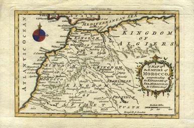| Keywords: T K Empire of Morocco.jpg en Map of the Empire of Morocco 18th century <br/> A Map of the Empire of Morocco Comprehending the Kingdoms of Fez Morocco Etc By T Kitchin Geogr London 1760 Colored 4¼X7 The map shows the Kingdoms of Morocco and Fez Tafilet and Segelmese depicting towns harbors and settlements Locates the Straits of Gibraltar and the Mediterranean Sea and the southern coasts of Spain and Portugal Includes a colorful compass rose and a decorative title cartouche with leaves flowers and scrolls in bottom right Published in the London Magazine in 1760 it was engraved by Thomas Kitchin one of London's premier engravers http //www gracegalleries com/Africa_Listings htm gracegalleries com http //www mostlymaps com/reference/Map-Makers/thomas-kitchen php Thomas Kitchin 1718 - 1784 1760 Empire of Morocco Maps of the history of Morocco Old maps of Morocco Thomas Kitchin 1760 maps Source http //www gracegalleries com/Africa_Listings htm www gracegalleries com PD-old-100 |