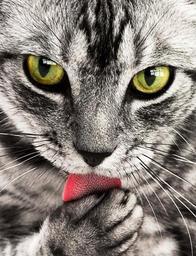 Keywords: tabby cat close-up portrait feline animal pet licking paw cute