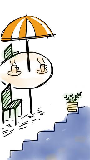 Keywords: table coffee tea afternoon tea umbrella beach umbrella chairs outdoor furniture stairs pot flower pot plant yellow big umbrella happy joy leisure relax lifestyle sketch doodle