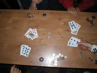 Keywords: Table game of cards birds eye view.JPG A table during a casual game of cards from a bird's eye view Table includes cards and money 2007-01-06 own assumed Esteffect Playing cards