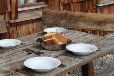 Keywords: table gedeckter table cover seat cutlery covered plate wooden table bread eat even baked vespers snack simply break ski holiday ski lodge self catering mountain hut originally wood wooden bench still life