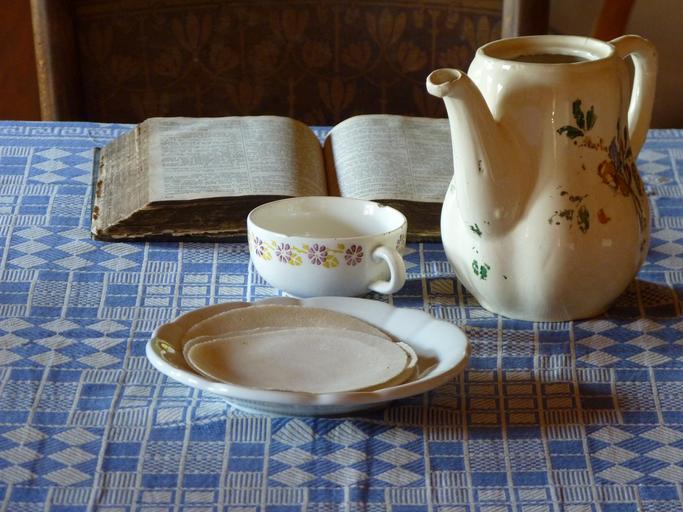 Keywords: table tablecloth plate pot cup book lunch gedeckter table decoration pattern drink arrangement teetafel old museum still life
