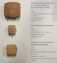 | Keywords: Tablets in Sumerian language - (1) Umma, 3rd year of reign of Shu-Suen, c. 2035 BC, (2) Uruk, Ur III Period, 2100-2000 BC, (3) Drehem, c. 2039 BC - Oriental Institute Museum, University of Chicago - DSC07082.JPG en Exhibit in the Oriental Institute Museum University of Chicago Chicago Illinois USA This work is old enough so that it is in the public domain Photography was permitted in the museum without restriction 2014-08-22 14 33 18 own Daderot other versions cc-zero Sumerian inscriptions in the Oriental Institute Museum Uploaded with UploadWizard |