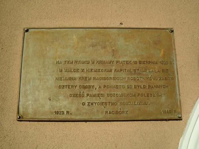 Keywords: Tablica na raciborskim rynku.JPG pl Tablica na rynku w Raciborzu z 1966 roku upamiętniająca strajk robotników z 10 sierpnia 1923 roku own Olos88 Cc-zero Market Square Racibórz Plaques in Silesian Voivodeship