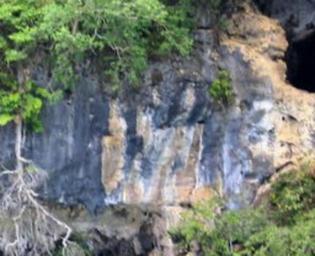 | Keywords: Tabon cave burial procession mural and shark.jpeg This section outside the cave was identified by Philip Maise in 2015 Many elements indicate this is a man made mural 1 The large curve near the bottom is clearly a large shark The head is to the left This was created first and likely dates to before the jar burial period that began 5 000 years ago 2 The jar burial procession was logically carved before that period ended 1500 years ago Despite the newer mural some of the shark's body is still visible 3 On the left of the photo are regular notches These appear to be hand and foot holds 4 The circular object in the center is the jar It is depicted with a lid a canoe on top and a figurine of depicting the person that the jar was prepared for These details are similar to the Manunggul Jar 5 To the right is a bayawan waving a talisman and forever frozen in time mid-step Notice the right leg is raised The bayawan is the equivalent of a kumu mahu in Hawaii Likely this means it may be the first image of someone of the third gender 6 Behind are four individuals carrying the jar A bamboo frame supports the jar as they carry it on their shoulders 7 Details are still clear enough to see two figures are on the near side of the jar and two on the far side Uncategorized 2015 June 9 |