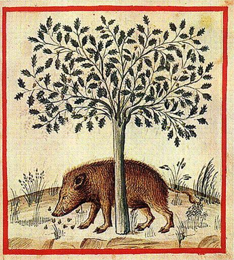 | Keywords: Tacuin Gland15.jpg en Acorns Glandes Nature Cold in the second degree dry in the third Optimum Those that are fresh and large Usefulness They help rentention Dangers They prevent menstration Neutralization of the Dangers By eating them roasted and with sugar From the Tacuinum of Rouen fr Glands glandes Nature froids au second degré sec au troisième degré Optimum Ceux qui sont volumineux et frais Utilité Ils aident la rétention Dangers Elles empêchent la menstruation Neutralisation des dangers En les mangeant grillées et sucrées book scan unknown master century 14 PD-Art Tacuinum sanitatis - BM Rouen Leber 1088 Acorns in art Medieval miniature of pigs Acorn-based food |