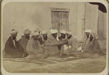 | Keywords: Tadzhik Craft Customs. A Vow. Ritual of Feeding Bread during a Guild Initiation WDL11005.png Artwork ru Кун Александ Людвигович 1840 1888 гг fr Kun Aleksandr L 1840-1888 en Kun Aleksandr L 1840-1888 zh 亚历山大·L· ,1840-1888 年 pt Kun Aleksandr L 1840-1888 ar كُن، ألكسندر ل ، 1840-1888 es Kun Aleksandr L 1840-1888 ru Таджикские емесленные об яды Обет Ритуал ко мления хлебом во в емя посвящения fr Traditions artisanales tadjikes Un serment Rituel consistant à nourrir de pain durant une initiation de guilde en Tadzhik Craft Customs A Vow Ritual of Feeding Bread during a Guild Initiation zh 塔吉克的手工艺习俗 起誓 入会仪式中的喂食 包仪式 pt Costumes dos tadjiques Um voto Ritual de alimentar com pão durante uma iniciação da guilda ar عادات الحرفيين الطاجيك عهد طقوس إطعام الخبز بمناسبة الانضمام للنقابة ru Эта фотог афия входит в этног афическую часть <em> Ту кестанского альбома </em><em></em> всесто оннего исследования Цент альной Азии п едп инятого после того как в 1860-х годах в егионе установилось господство Российской импе ии Альбом созданный по аспо яжению гене ала Константина Пет овича фон Кауфмана 1818 1882 годы пе вого гене ал-губе нато а оссийского Ту кестана состоит из четы ех частей в шести томах «Часть а хеологическая» два тома «Часть этног афическая» два тома «Часть п омысловая» один том и «Часть исто ическая» один том Основным составителем альбома был оссийский востоковед Александ Людвигович Кун аботавший совместно с иколаем Венедиктовичем Богаевским В альбоме п едставлено около 1200 фотог афий а также а хитекту ные планы аква ельные исунки и ка ты «Часть этног афическая» включает в себя 491отдельную фотог афию на 163 листах а фотог афиях изоб ажены п едставители азличных на одов егиона листы 1 33 повседневная жизнь и итуалы листы 34 91 а также виды де евень и го одов уличные то говцы и комме ческая деятельность листы 92 163 <br>Хлеб; Этног афические фотог афии; Ремесленные цехи; Фотог афические исследования; Об яды и це емонии; Таджики fr Cette photographie est extraite de la partie ethnographique de l'<em>Album du Turkestan</em> étude visuelle complète de l'Asie centrale entreprise après que l'Empire russe prit le contrôle de la région dans les années 1860 Commandé par le général Konstantin Petrovich von Kaufman 1818 1882 premier gouverneur général du Turkestan russe l'album est composé de six volumes en quatre parties la partie archéologique deux volumes la partie ethnologique deux volumes la partie sur les métiers un volume et la partie historique un volume L'album fut essentiellement compilé par l'orientaliste russe Aleksandr L Kun assisté de Nikolai V Bogaevskii Il comporte près de 1200 photographies et inclut également des plans architecturaux des dessins à l'aquarelle et des cartes La partie ethnographique compte 491 photographies sur 163 planches montrant des individus des différentes peuplades de la région planches 1 à 33 des scènes de la vie quotidienne et des rites planches 34 à 91 ainsi que des vues de villages et de villes de vendeurs ambulants et d'activités commerciales planches 92 à 163 <br>Pain; Photographies ethnographiques; Guildes; Inventaires photographiques; Rites et cérémonies; Tadjiks en This photograph is from the ethnographical part of <em>Turkestan Album</em><em> </em>a comprehensive visual survey of Central Asia undertaken after imperial Russia assumed control of the region in the 1860s Commissioned by General Konstantin Petrovich von Kaufman 1818 82 the first governor-general of Russian Turkestan the album is in four parts spanning six volumes Archaeological Part two volumes ; Ethnographic Part two volumes ; Trades Part one volume ; and Historical Part one volume The principal compiler was Russian Orientalist Aleksandr L Kun who was assisted by Nikolai V Bogaevskii The album contains some 1 200 photographs along with architectural plans watercolor drawings and maps The Ethnographic Part includes 491 individual photographs on 163 plates The photographs show individuals representing the different peoples of the region Plates 1 33 ; daily life and rituals Plates 34 91 ; and views of villages and cities street vendors and commercial activities Plates 92 163 <br>Bread; Ethnographic photographs; Guilds; Photographic surveys; Rites and ceremonies; Tajiks zh 这张照片出自<em> 其斯 相册 </em>的民族部分,该相册是俄罗斯 国 19 世纪 60 年代取得中亚控制 后, 手制 的 部针对该 区的综合 图像调查记录 相册由俄罗斯驻 其斯 (俄罗斯 国中亚属 的名称)首任 康斯 丁·彼得罗维奇·凡· 夫曼(Konstantin Petrovich von Kaufman,1818 82 年)将军赞助完成,共分六卷,四个部分: 古部分 (两卷); 民族部分 (两卷); 贸易部分 ( 卷)和 历史部分 ( 卷) 相册的主要编纂人是俄罗斯 方学 亚历山大·L· Aleksandr L Kun 亚历山大是 尼可莱·V·柏