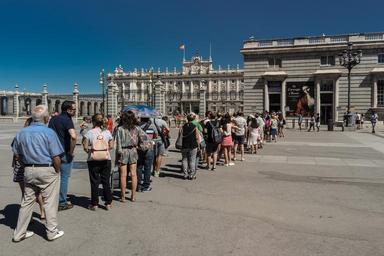 Keywords: tail people crowd tourists exhibition holiday summer group wait women men