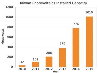 | Keywords: Taiwan Photovoltaics Installed Capacity.svg translate yes en Installed photovoltaics in Taiwan from 2010 to 2015 Source http //www iea-pvps org/fileadmin/dam/public/report/PICS/IEA-PVPS_-__A_Snapshot_of_Global_PV_-_1992-2015_-_Final_2_02 pdf IEA-PVPS 2016-05-03 own Delphi234 other versions cc-zero Solar energy in Taiwan Photovoltaic power statistics |