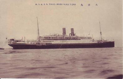 | Keywords: Taiyo Maru Postcard.JPG en NYK Line Taiyo Maru Postcard was created in the late 1920s ja 日 郵船 大洋丸 1926年から1929年(日 郵船のファンネルマーク制定年)ごろまでに 成された絵葉書 own collection Ogiyoshisan s 1920 the latter half<br/>2012-07-11 PD-old Taiyo Maru ship 1911 Postcards of ships of Japan 1920s postcards 1920s photographs Japan in the 1920s |