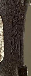 | Keywords: Takahashi Yoshitsugu - Tsuba with Buddha and Demon in Mountains - Walters 51304 - Mark A.jpg Depictions of a rocky mountain surround fill this tsuba At the upper left is Buddha who is identifiable by his robes and halo around his head At the lower right is a demon On the reverse are more moutains and trees between 1842 1873 late Edo-Meiji iron gold copper shibuichi lead shakudo cm 8 45 7 72 0 5 accession number 51 304 17750 Henry Walters Baltimore date and mode of acquistion unknown Walters Art Museum Henry Walters Acquired by Henry Walters Signature Yoshitsugu sei; Translation Made by Yoshitsugu place of origin Edo present-day Tokyo Japan Walters Art Museum license Tsuba in the Walters Art Museum Takahashi Yoshitsugu Media contributed by the Walters Art Museum needs category review |