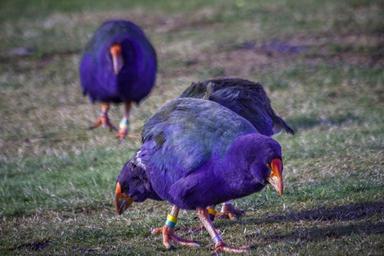 | Keywords: outdoor The takahē, Notornis, or South Island takahē (Porphyrio hochstetteri) is a flightless bird indigenous to New Zealand and belonging to the rail family. The takahē is the largest living member of the family Rallidae. Its overall length averages 63 cm (25 in) and its average weight is about 2.7 kg (6.0 lb) in males and 2.3 kg (5.1 lb) in females, ranging from 1.8–4.2 kg (4.0–9.3 lb).[3] The standing height is around 50 cm (20 in).[4] It is a stocky bird, with reduced wings, strong legs and a massive bill. The adult takahē is mainly purple-blue in colour, with a greenish back and inner wings. It has a red frontal shield and red-based pink bill. The legs are pink. Sexes are similar, the females being slightly smaller, but young birds have mainly pale brown plumage. Immatures have a pinkish bill with bluish cast. en.wikipedia.org/wiki/Takahē en.wikipedia.org/wiki/Orokonui_Ecosanctuary youtu.be/ir8ye-gp5ts The takahē, Notornis, or South Island takahē (Porphyrio hochstetteri) is a flightless bird indigenous to New Zealand and belonging to the rail family. The takahē is the largest living member of the family Rallidae. Its overall length averages 63 cm (25 in) and its average weight is about 2.7 kg (6.0 lb) in males and 2.3 kg (5.1 lb) in females, ranging from 1.8–4.2 kg (4.0–9.3 lb).[3] The standing height is around 50 cm (20 in).[4] It is a stocky bird, with reduced wings, strong legs and a massive bill. The adult takahē is mainly purple-blue in colour, with a greenish back and inner wings. It has a red frontal shield and red-based pink bill. The legs are pink. Sexes are similar, the females being slightly smaller, but young birds have mainly pale brown plumage. Immatures have a pinkish bill with bluish cast. en.wikipedia.org/wiki/Takahē en.wikipedia.org/wiki/Orokonui_Ecosanctuary youtu.be/ir8ye-gp5ts |