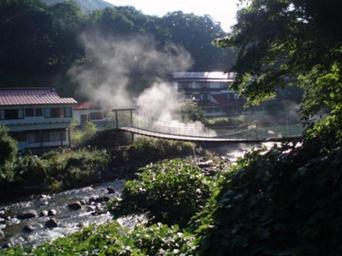 Keywords: Takanoyu Onsen Bridge and Hot Spring 005.JPG en Photo of Takanoyu Onsen and steam rising from the hot spring Akita Prefecture Japan own RickardA 2007-09-21 Takanoyu Onsen Suspension footbridges in Japan Bridges in Akita prefecture