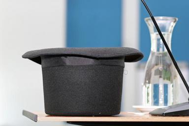 Keywords: tall hat hat black hat water microphone conference blue magician