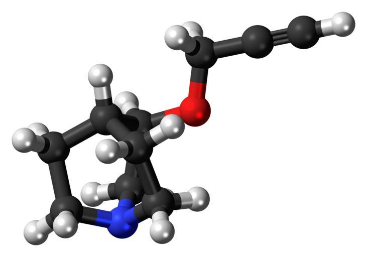 | Keywords: Talsaclidine 3D ball.png Ball-and-stick model of the talsaclidine molecule Colour code 505050 Carbon C black<br> F0F0F0 Hydrogen H white<br> F51E1E Oxygen O red<br> 3C50FA Nitrogen N blue<br> 2011-07-15 own DS Visualizer Jynto talk Space-filling version cc-zero Images by Jynto Quinuclidines Muscarinic agonists Alkynyl ethers |