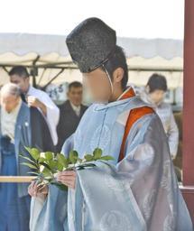Keywords: Tamagushi.jpg en A Shinto priest kannushi with a tamagushi an offering made from a sakaki-tree branch and strips of paper silk or cotton Own Urashimataro 2009-03 Public domain Shintō items Kannushi Kariginu