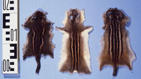 | Keywords: Tamias striatus & Funambulus palmarum & Tamius sibiricus (Burunduk) fur skins.jpg en Eastern chipmunk fur skins Tamias striatus ; Indian palm squirrel Funambulus palmarum ; Siberian chipmunk Tamias sibiricus At the fur skin collection Bundes-Pelzfachschule Frankfurt/Main Germany Senckenbergmuseums Frankfurt/Main Own Mickey Bohnacker Presse-Fotograf Frankfurt/Main ca 1978 Die freie Nutzung erfolgt mit zusätzlichem Einverständnis des C B -Verlag Carl Boldt Peter Geselius Fur skin collection Frankfurt/Main Tamias striatus Funambulus palmarum Burunduk fur-skins Squirrel fur-skins |