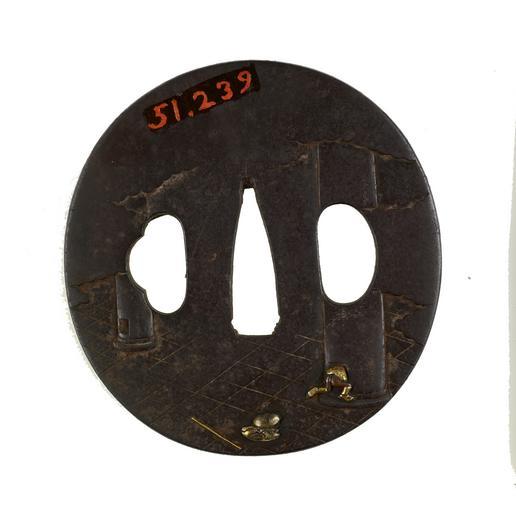 Keywords: Tamura Tadayuki - Tsuba with a Gate Guardian at Todaiji - Walters 51239 - Back.jpg The large figure on the right of the tsuba is one of the paired guardians ni-ô who guard the main south gate at Buddhist temples in Japan These fierce looking figures protect temples from evil spirits In front of the statue is a pilgirm At the lower left is another pilgrim with his staff and hat laying near him On the reverse is a man crawling through a hole in a pillar This reveals that the temple is Todaiji in Nara The pillar is in the Great Buddha Hall and the hole is said to be the size of the nostrils of the Buddha statue The statue itself is forty nine feet high Those who successfully pass through the hole in the pillar are believed to gain enlightenment in their next life ca 1800 Edo iron gold silver copper cm 6 9 6 58 0 47 accession number 51 239 34271 Henry Walters Baltimore date and mode of acquisition unknown Walters Art Museum Henry Walters Acquired by Henry Walters Signature Tadayuki place of origin Japan Walters Art Museum license Tsuba in the Walters Art Museum Tamura Tadayuki Media contributed by the Walters Art Museum needs category review |