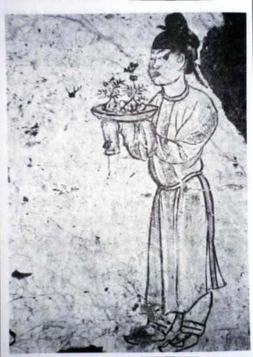 Keywords: Tang dynasty penzai.JPG Penzai penjing on a mural 706 CE in the Tang Dynasty tomb of Prince Li Xian zh-hans 唐章 太子 贤墓 706年 壁画中内 手托浅盆 mybook anon 706 PD-old-100 Penjing 01 Tang Dynasty art