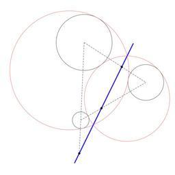 | Keywords: Tangent circles to three circles radical axis.svg en The homothetic centers of three circles lay on four lines Each line is a radical axis for a conjugate pair of circles which are tangent to all three given circles own Cleric K Circle geometry |