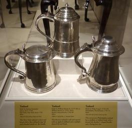| Keywords: Tankards, by Simeon Soumain, New York City, c. 1730, William Homes Sr or Jr, Boston, 1760-1780, Philip Syng Jr, Philadelphia, 1750-1772, silver - Winterthur Museum - DSC01446.JPG en Exhibit in the Winterthur Museum New Castle County Delaware USA Photography was permitted in the museum without restriction This work is in the public domain because the artist died more than 70 years ago 2013-05-08 12 14 47 own Daderot cc-zero Metalwork in Winterthur Museum Uploaded with UploadWizard | ||||