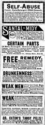 | Keywords: TansyPills.jpg A Victorian or turn-of-the-20th-century newspaper clipping Source Encylopedia Titanica http //www encyclopedia-titanica org/cgi-bin/discus/show cgi tpc 5670 post 140809 Full copy An approximate reading of the text SELF-ABUSE Cured Parts enlarged FREE remedy A victim of youthful errors causing emissions small parts lost manhood varicocele nervous debility etc will send sealed FREE to all fellow sufferers a simple means of certain self-cure which he discovered after trying in vain all known remedies Address with stamp L S Franklin Music Dealer Marshall Mich SANITAL-MIDY Midy In 48 hours gonorrhea and discharges from the urinary organs are arrested by Sanital-Midy Capsules without illegible Price 1 Of all druggists or P O Box 2081 New York CERTAIN PARTS of body enlarged Beware of bogus free cures Cures all weakness Send for the illegible method Surest and safest developing illegible Increases sexual power Sealed information free Address Albion Pharmacy Co Albion Mich Box 18 FREE REMEDY Manhood restored Small weak organs enlarged Emissions impotency varicocele and all effects of Self-Abuse or Excess cured Never returns I will gladly send sealed FREE to all sufferers a recipe that cured me of illegible Address with stamp L A Bradley Battle Creek Mich DRUNKENESS is a disease and can be cured by administering Dr illegible Golden Specific It can be given without the knowledge of the patient if desired by placing it in coffee tea or articles of food Cures guaranteed Send for free circulars Golden Specific Co 185 Race St Cincinnati O WEAK MEN suffering from lost manhood youthful errors spermatorrhea gonorrhea illegible syphllis and all private diseases Illegible Illegible quietly at home 30 years experience Book free Dr D H Lowe Winsted Conn WEAK nerves sufferers from youthful errors majority of ad illegible I will send one full sized package free of charge to any illegible sufferers Address Dr F B Clarke East Haddon Conn DOCUTA SANDAL WOOD CAPSULES are the best and only capsules that are prescribed by regular physicians for the cure of gonorrhea and discharges from the urinary organs Several cases cured in 7 days 1 50 per box All druggists Dr Caton's Tansy Pills The most reliable remedy for ladies Always safe effectual and the only guaranteed women's salvation Price 1 Second advice free R F Caton Boston Mass PD-old original upload log 1 date/time username edit summary ---- 04 49 8 December 2005 en User Kyd <nowiki> PD-old A Victorian or turn-of-the-20th-century newspaper clipping The relevant text reads Dr Caton's Tansy Pills The most reliable remedy for ladies Always safe effectual and the only guaranteed womens' salvation Price illegible R F Ca </nowiki> Gonorrhea posters and product advertisements History of abortion Advertisements in the United States Medicine advertising |