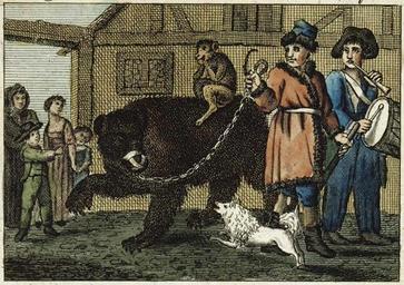 | Keywords: Tanzbär 1810.jpg de Tafel V aus Johann Ferdinand Schlez BilderFibel zur Beförderung der LautMethode Ein Versuch die Absicht des ABC-Bilderwesens durch eine neue Anwendung desselben besser zu erreichen nebst einem Lesebuch Giessen u a 1810 Entsprechender Lehrbuchtext Erklärung der Vten Tafel Nro 9 Ein Bär von seinem Führer an einem Nasenringe durch eine Kette gehalten brummt seitwärts mit finsterm Angesichte gegen ein kleines Hündchen M - m - m brummt er - Was doch der alte Brummer gegen den kleinen Spitz einzuwenden hat - Je nun es verdrießt ihn daß der kleine Belfer mit seinem r - r - r - r ihn anknurrt Verdenkt ihr das dem gefesselten Helden - Wie würd' es dem muthwilligen Necker gehn wenn der Führer den Bären los ließe Welcher von beiden hier unten stehenden Buchstaben ist der Brumm und welcher der Marrlaut Könnt ihr beide auch im Buche finden 1810 http //www bbf dipf de/cgi-opac/bil pl t_direct x f_IDN b0087754berl author Ursari Gießen 1810 in art Street performers Roma people in Germany Roma people in art Dancing bears People with bears in art People with monkeys in art Animals sitting on other animals Images from Pictura Paedagogica PD-old-100 |