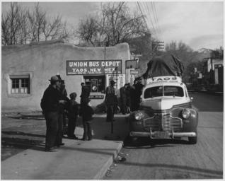 Keywords: taos new mexico 1941 black and white bus depot station building people taxi vehicle waiting street sidewalk trees