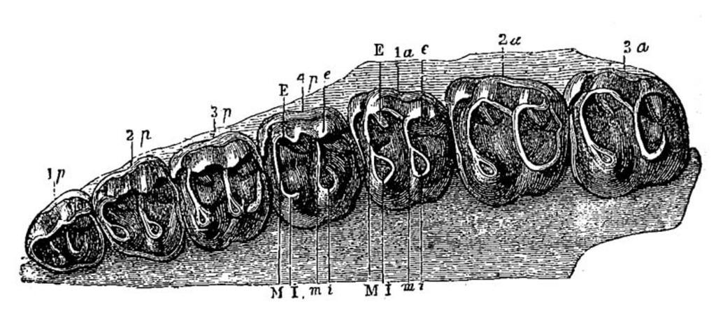 Keywords: Tapirus priscus jaw.jpg Сл 5 - Лева ст ана го ње вилице једнога од најста ијих тапи а иоцен код Епелсхајма - Tapirus priscus 3/5 п и одне величине 1p до 4p јесу п едњи кутњаци - 1а 2а 3а задњи кутњаци Е спољни с едњи I унута њи зупци п вих ежања; c спољни m с едњи i унута њи зупци задњих едова Project Rastko Kameno doba |