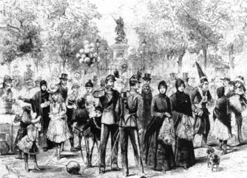 | Keywords: Tarde de domingo en la Alameda, Santiago de Chile..jpg es Tarde de domingo en la Alameda Santiago La Alameda cuenta con una triple avenida de árboles con costados en el dibujo delante de la estatua de O'Higgins Oficiales conversan con señoritas de manto un santero penitente recibe limosna un heladero vende sus helados y los niños juegan con globos de gas http //www memoriachilena cl/temas/documento_detalle asp id MC0000431 Melton Prior reports in The Illustrated London News 1891 PD-old Santiago de Chile in art ILN 1891 1891 |