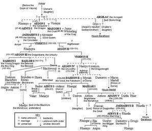 | Keywords: Targtree2.png family tree of House Targaryen from George R R Martin's A Song of Ice and Fire series en wikipedia 2005-04-13 Leederick wikipedia en diagram Leederick Original upload log page en wikipedia Targtree2 png 2009-08-21 14 32 Scafloc 722×620× 34866 bytes <nowiki>Added -mariages of Viserys with an unknown Arryn and an unknown Hightower -Daena sister-bride of Baelor mother of Daemon with Aegon IV -Daenerys sister of Daeron II wife of Maron Martell</nowiki> 2006-12-15 15 01 Scafloc 722×620× 34270 bytes <nowiki> original file family tree of House Targaryen from George R R Martin's A Song of Ice and Fire series del cur 16 2 14 December 2006 Adjusted original picture of Leederick included mariage between Rhaella Unknown Baratheon Talk contribs </nowiki> 2006-12-15 14 50 Scafloc 690×620× 33790 bytes <nowiki>original file family tree of House Targaryen from George R R Martin's A Song of Ice and Fire series del cur 15 49 14 December 2006 Adjusted original picture of Leederick included mariage between Rhaella Unknown Baratheon Talk contribs </nowiki> 2005-04-13 20 22 Leederick 659×620× 16202 bytes <nowiki> leederick original file family tree of House Targaryen from George R R Martin's A Song of Ice and Fire series </nowiki> A Song of Ice and Fire family trees |