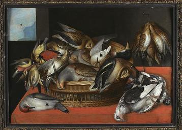 | Keywords: Tavla. Måleri. Stilleben, döda fåglar - Skoklosters slott - 85716.tif Stor flätad korg på bord med röd duk Korgen fylld med döda fåglar talgoxe domherre gulsparv bofink el möjl tallbit grönfink gråsparv domherre taltrast enkelbeckasin ljunghare i höstdräkt rapphöna höna rapphöna tupp kärrsnäppa i höstdräkt gräsand kricka På väggen hänger ett knippe sånglärkor På bordet ligger en gröngöling el gråspett samt två tamduvor Till vänster fönsterutsikt spindelväv och spindel Sign i nedre högra hörnet PB <br/>Förgylld empireram Ramlistens bredd 100 mm På ramen skrivet med bläck Målad av Frankfurtermästaren Peter Benoit 1613-31 original caption Tavla Måleri Stilleben döda fåglar <br/> Nyckelord Peter Binoit Fåglar Målning Insekter Stilleben Död Föremålsbild ca 1618 oil on canvas size mm 745 540 SKO Carl Gustaf Wrangel PB place of origin original filename sm_dig0887 23007 inventory number SKO 1740 85716 PD Samuel Uhrdin Samuel Uhrdin Still life paintings Media contributed by LSH unmatched objKeyword Media contributed by LSH unmatched creator Media contributed by LSH unmatched keyword Media contributed by LSH 2013-10 |