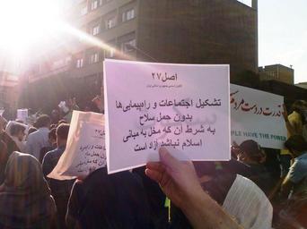 | Keywords: Tazahorat sabz (6).JPG Protest demonstration against election results 7th Tir thru Karimkhan to Vali Asr Sq and beyond Tehran Sign reads Article 27 of constitution says unarmed gatherings and demonstrations are free provided they dont disrupt the tenents of Islam myself on behalf of photographer Saba The photographer nicknamed Saba wishes to remain anonymous I have permission from photoghrapher to upload to WikiCommons under PD license Contact me for verification Protests relating to the Iranian presidential election 2009 from 7th Tir to Vali Asr Tehran |