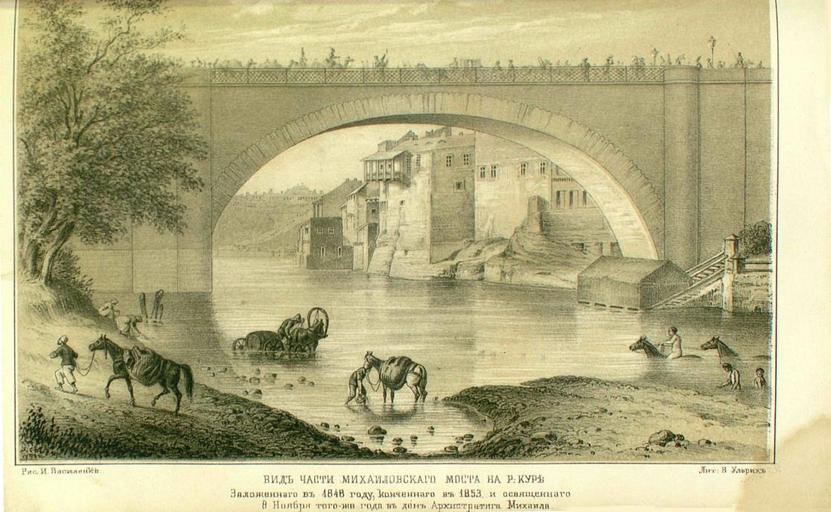 Keywords: Tbilisi, Mikhailovski bridge.jpg ka მიხაილ ვის ხიდი en Tbilisi Mikhailovski bridge until 1860 http //dlib rsl ru/viewer/01003825044 page 512 Кавказский календа ь на 1857 годъ author other versions pd-old Bridges in Tbilisi