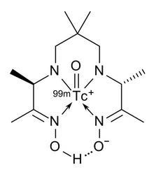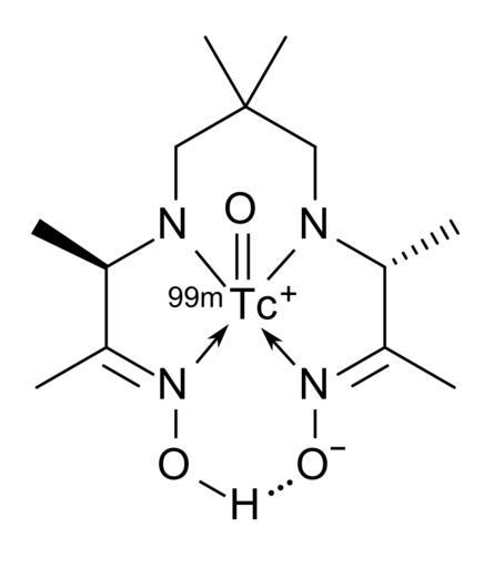 Keywords: Tc-99m exametazime skeletal.svg Technetium <sup>99m</sup>Tc exametazime own Anypodetos 2009-11-22 BKchem 001 -check Radiopharmaceuticals Technetium complexes N-donor complexes