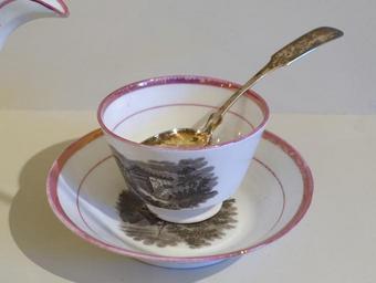 | View Original: | Teacup and saucer, England, mid to late 1800s, earthenware with pink-luster glaze, teaspoon by G. Baker, Providence RI, c. 1825, silver - Concord Museum - Concord, MA - DSC05767.JPG (3828x2884) | |||