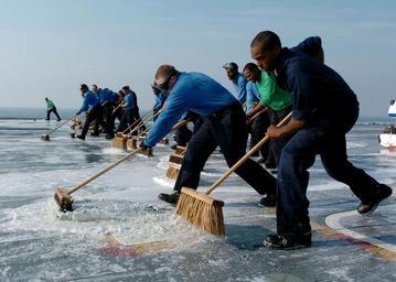 Keywords: teamwork scrubbing flight deck aircraft carrier sailors crew ship vessel military navy